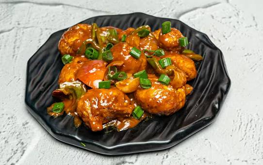 Crispy veg momos tossed with onion and pepper sauce.
